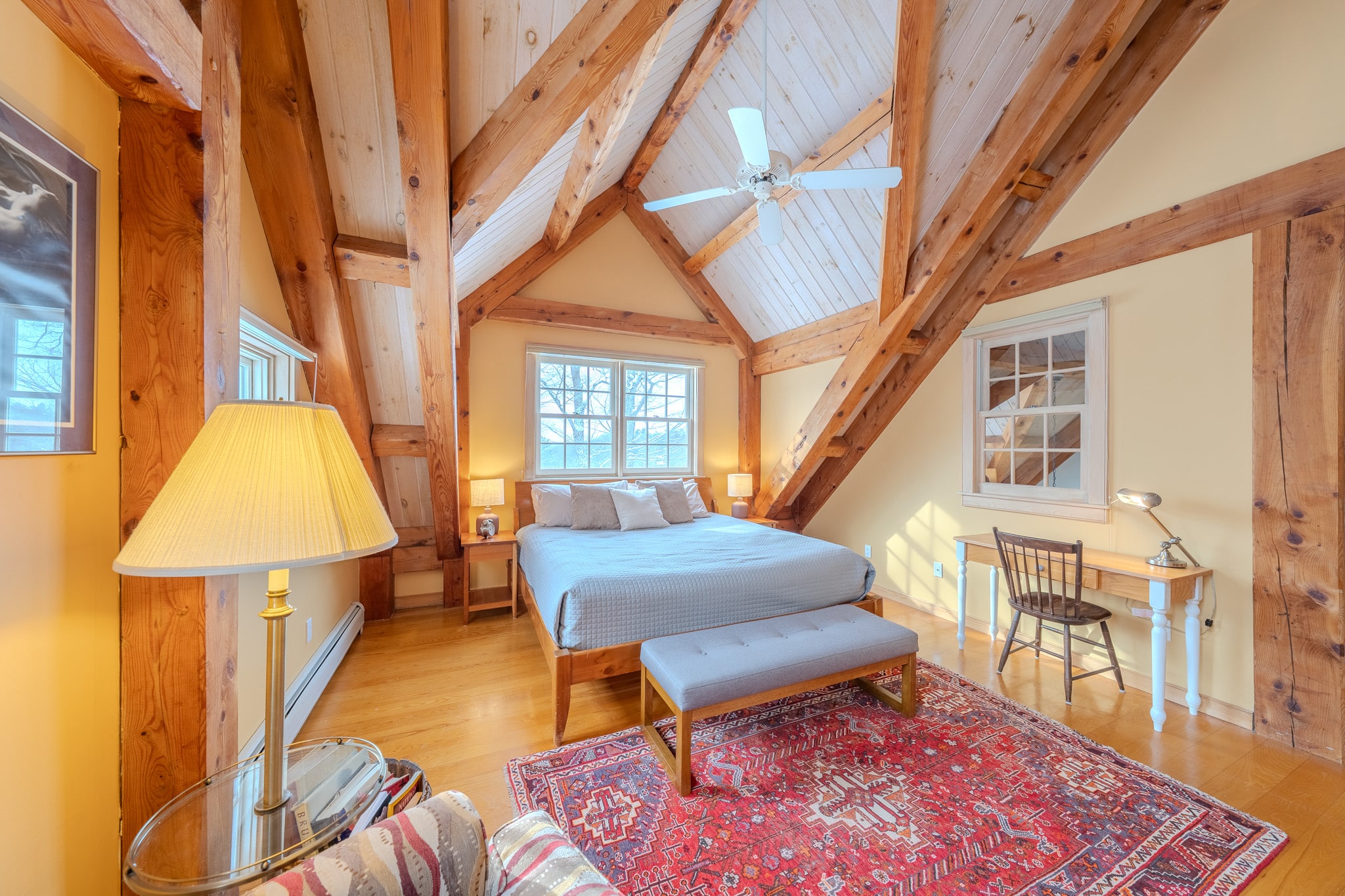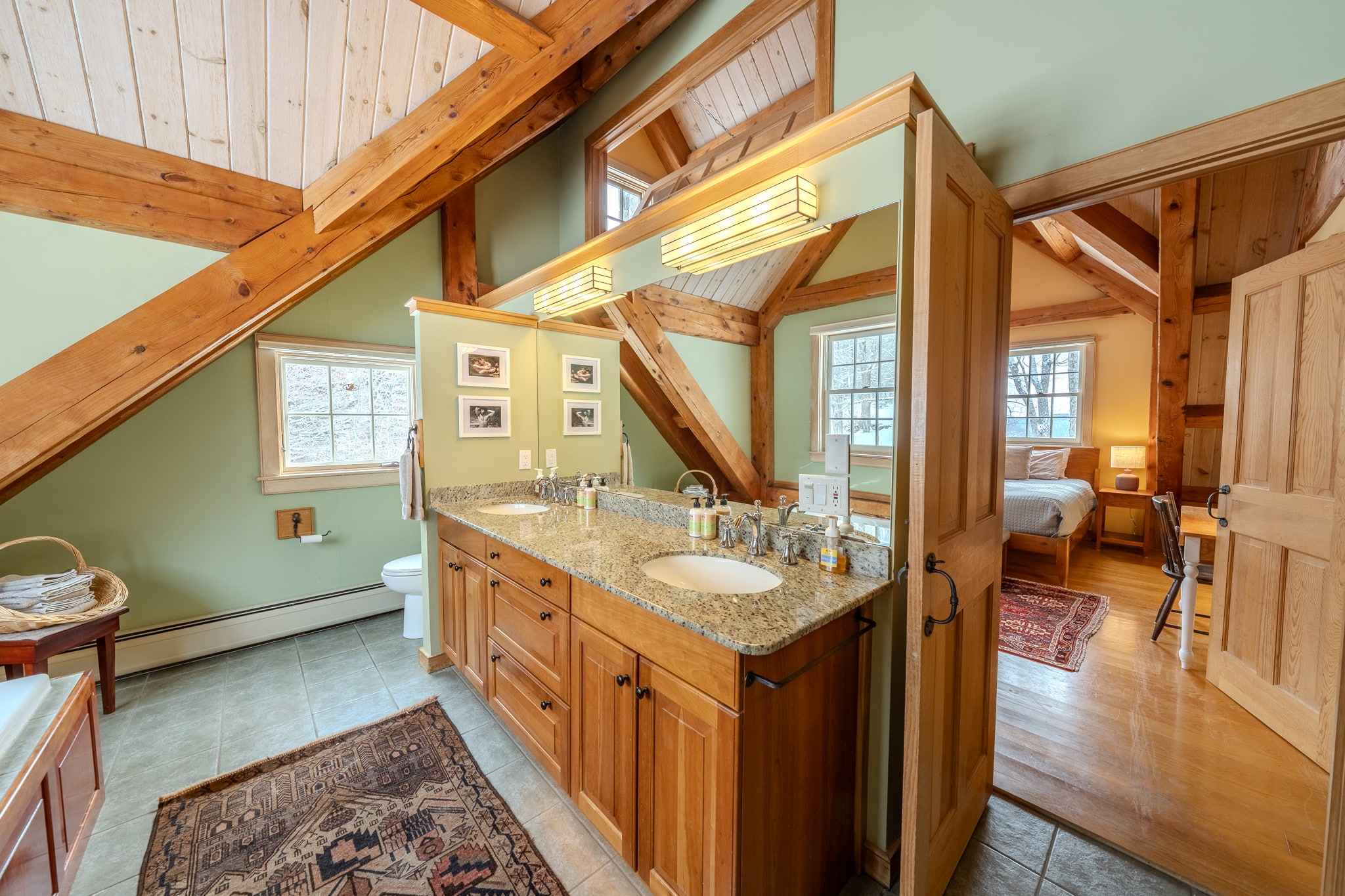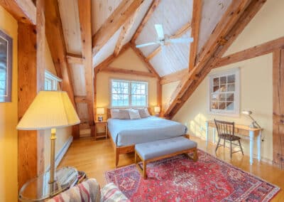 Vaulted, beamed ceilings give the suite a bright and airy feel, while southeast-facing windows provide lovely views of the grounds and surrounding hills. Deluxe amenities include a mini-fridge and whisper-quiet central air conditioning—everything you need for comfort and ease.