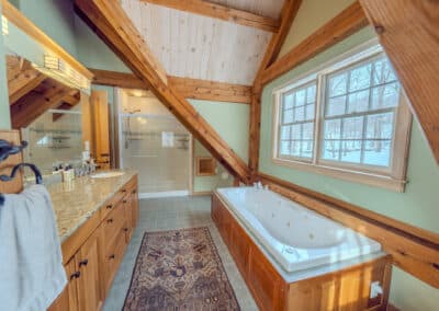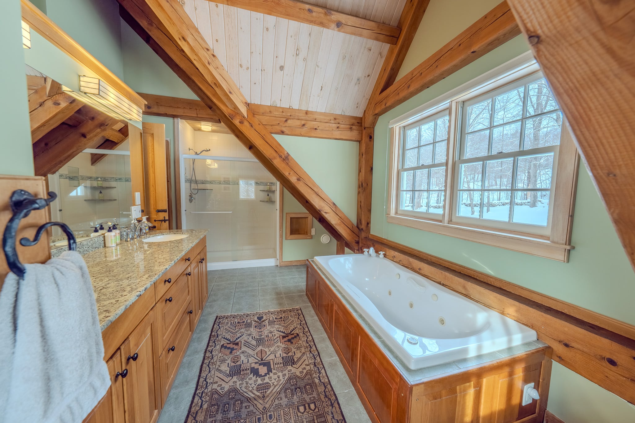 Welcome to the Frog Meadow Suite, our deluxe junior suite and the crown jewel of the Main House. This beautifully appointed room features a spacious en-suite bath with a two-person whirlpool jacuzzi tub and a separate walk-in shower accented with custom tilework—a private spa sanctuary right at your doorstep.
