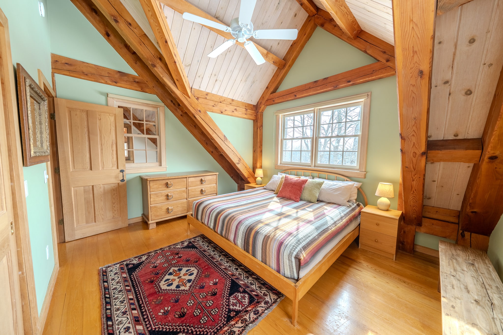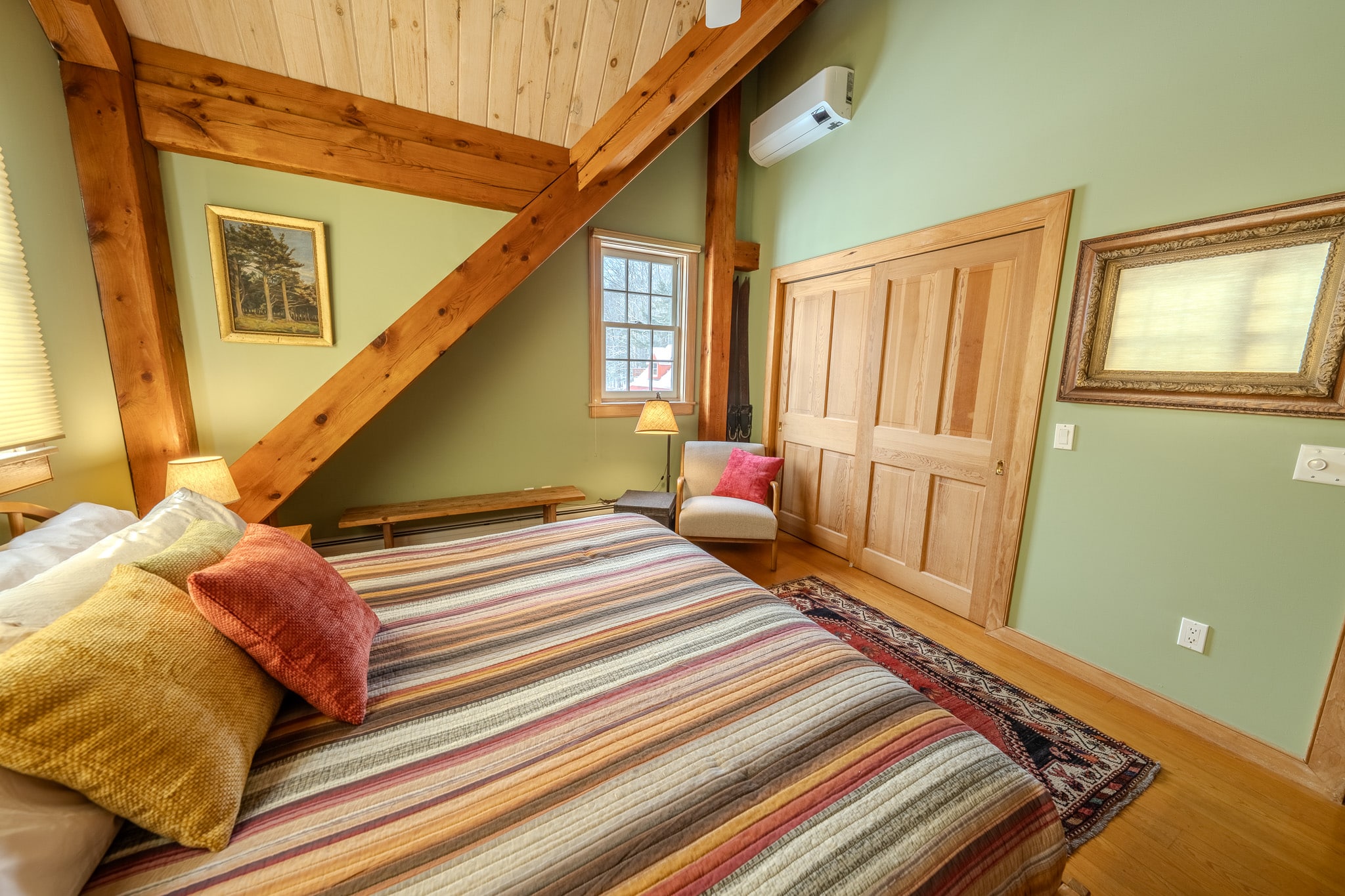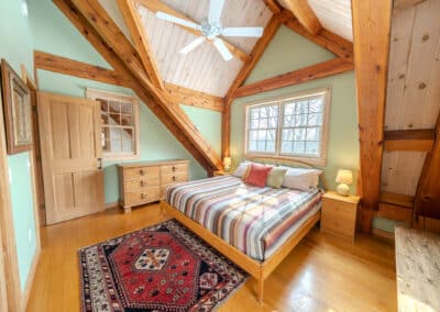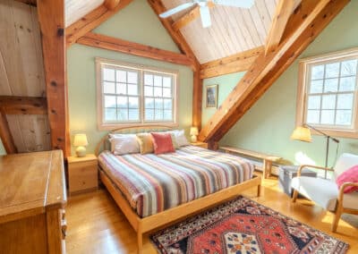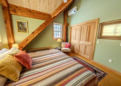 Bright, welcoming, and beautifully comfortable, the Main House South Room features a plush-yet-firm pillow-top king bed and sweeping views of the Vermont hills, swimming pond, and surrounding gardens. With its southwestern exposure, the room is naturally filled with warm, golden light and enjoys wonderful cross-breezes throughout the day. On the rare summer night when the air turns humid, quiet central air conditioning keeps the space cool and restful.