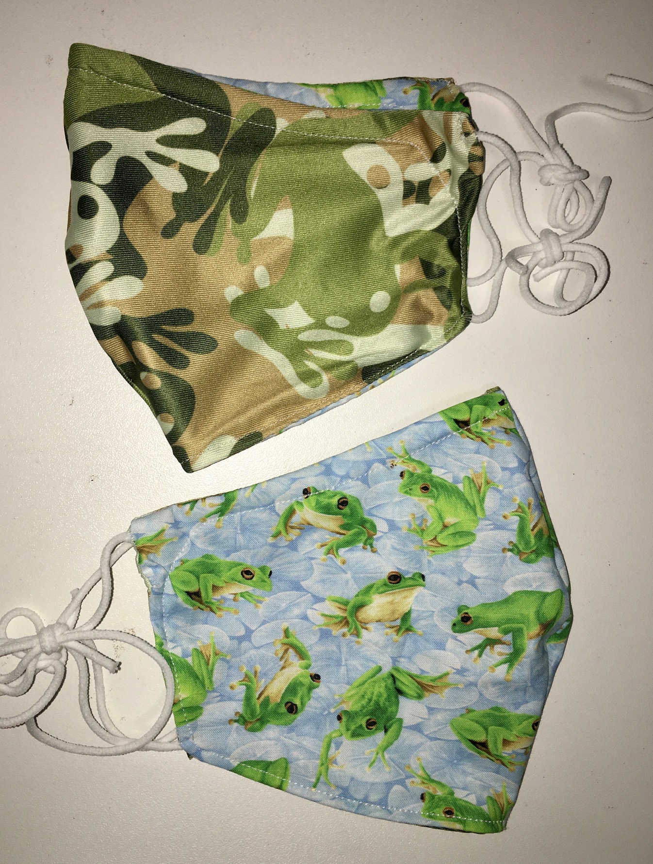 Our exclusive Frog Meadow Masks are made from frog-themed cotton fabric that will keep working to filter no matter how wet it gets – unlike paper, which stops working when it is moist because it relies on electrostatic quality to trap virus.